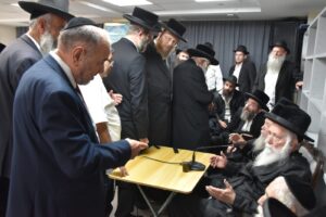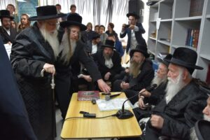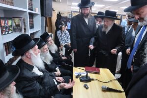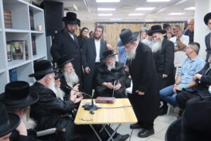 מעמד הכנסת ספר תורה לזכותו של פאר הדור הגרי"מ שכטר שנכנס למעונו בהשתתפות אדמורי"ם ורבנים. סעודת המצווה נחגגה ברוב פאר והדר באולם ויאמר יצחק בירושלים צילום:יהושע פרוכטר- יחיאל רייכמאן Iצפו בגלריה: