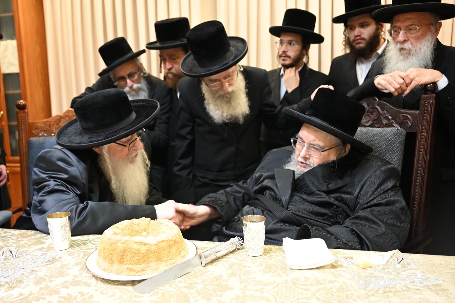 האדמו"ר מבאיאן עלה השבוע למעונו של מרן פוסק הדור הגר"מ שטרנבוך להתברך לרגל שמחת החתונה לנכדו לאחמ"כ נערך לחיים ופצחו בריקוד נלהב צילום:דוד ארזני I צפו בתיעוד: