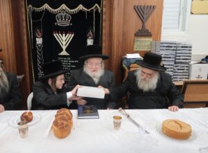 מעמד הכנסת ספר תורה לזכותו של פאר הדור הגרי"מ שכטר שנכנס למעונו בהשתתפות אדמורי"ם ורבנים. סעודת המצווה נחגגה ברוב פאר והדר באולם ויאמר יצחק בירושלים צילום:יהושע פרוכטר- יחיאל רייכמאן Iצפו בגלריה: